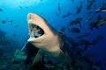 Here’s how the whole adventure works. They take us out to a site. All the operations meet at the same place. We get kitted out with gear and they give us extra weights. We plunge overboard and they lead us down to a ridge where they have sit on the bottom. Then they lower down two bins, one of which is suspended about 20 feet off the sea floor. As you might imagine, after years of this venture, the fish all know what’s going on and they are gathered by the thousands. It’s a swirl of color. Two divers then take big fish heads out of the bins and start waving them around, and, sure enough, the sharks come. And they are pretty big, perhaps 10 or 12 feet at the biggest. I know I saw four different kinds. They are all perfectly content to chow down on fish heads.