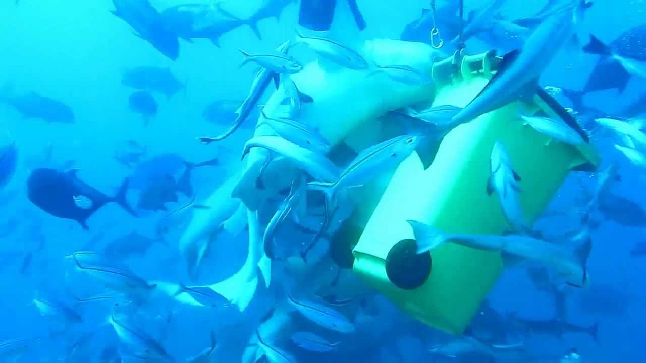 We finish after 30 or 40 minutes and take a break in the boat, then head down and do it all again. This time the sharks and fish have all gotten the message and there are more of them. The divers keep pulling out fish heads and the sharks keep coming. Then just before the end, they open up the suspended bin and 60 gallons of fishy guts spills out, causing a frenzy of activity. If you can get beyond
