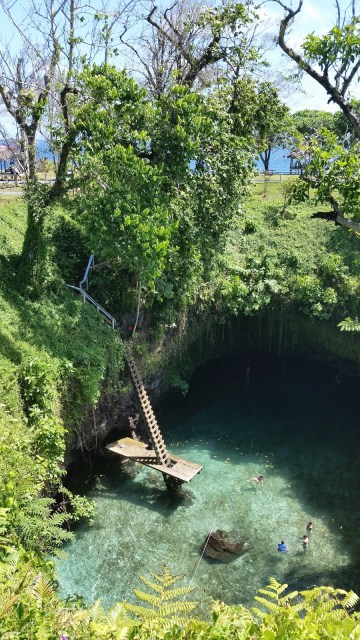 Or there is this place, To Sua Ocean Trench. Rated a “Place to see in your lifetime” by someone who rates such things. It’s an old lava tube that’s roof caved in. The ocean fills it through an underground tube. The only way down is via the ladder. As swimming holes go, it is pretty idyllic.