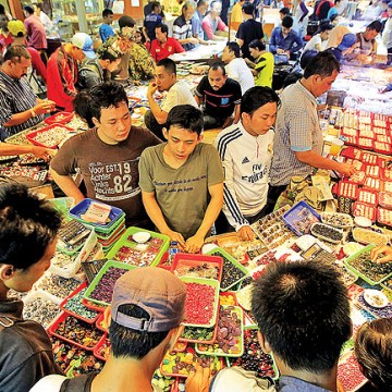 epa04744441 A general view of gemstone market in Rawa Bening, Jakarta, Indonesia, on 12 May 2015. A wave of enthusiasm for locally mined gemstones has swept Indonesia in recent months and traders say business is booming. It is a hot topic in coffee shops, on television and on the internet. Stalls selling stones have sprung up on the side streets and in alleyways in Jakarta and elsewhere. Gemstone or agate is a type of jewelry that is derived from mineral deposits that are formed into a stone with a beautiful colors and shapes. Gemstone jewelry business is one of the growing and expanding jewelry businesses in Asian markets, especially in Indonesia, Thailand, China, Sri Lanka. EPA/BAGUS INDAHONO
