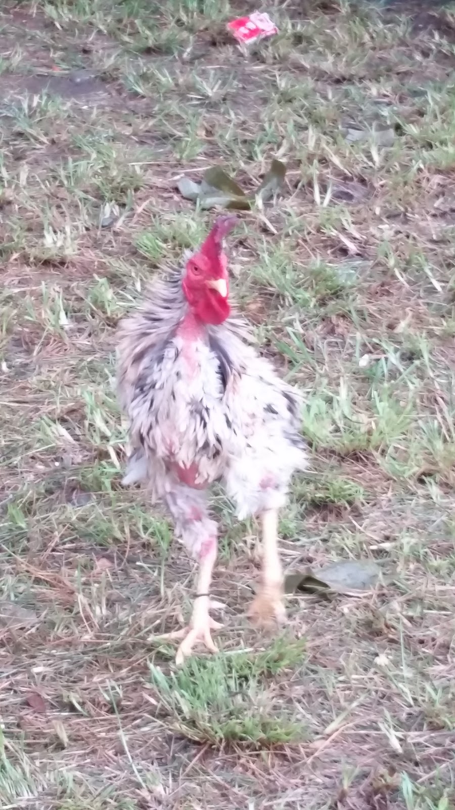 I opened the tall gate at the end of my driveway and found the security guard bent over clutching a good size rooster in his hands. Blue and green in plumage with a bright red crown. The rooster, not the guard. The skinny patriarch of a family that lives in a narrow lean-to crack between two houses down the block was stringing twine around the birds legs. The rooster waited surprisingly patiently.