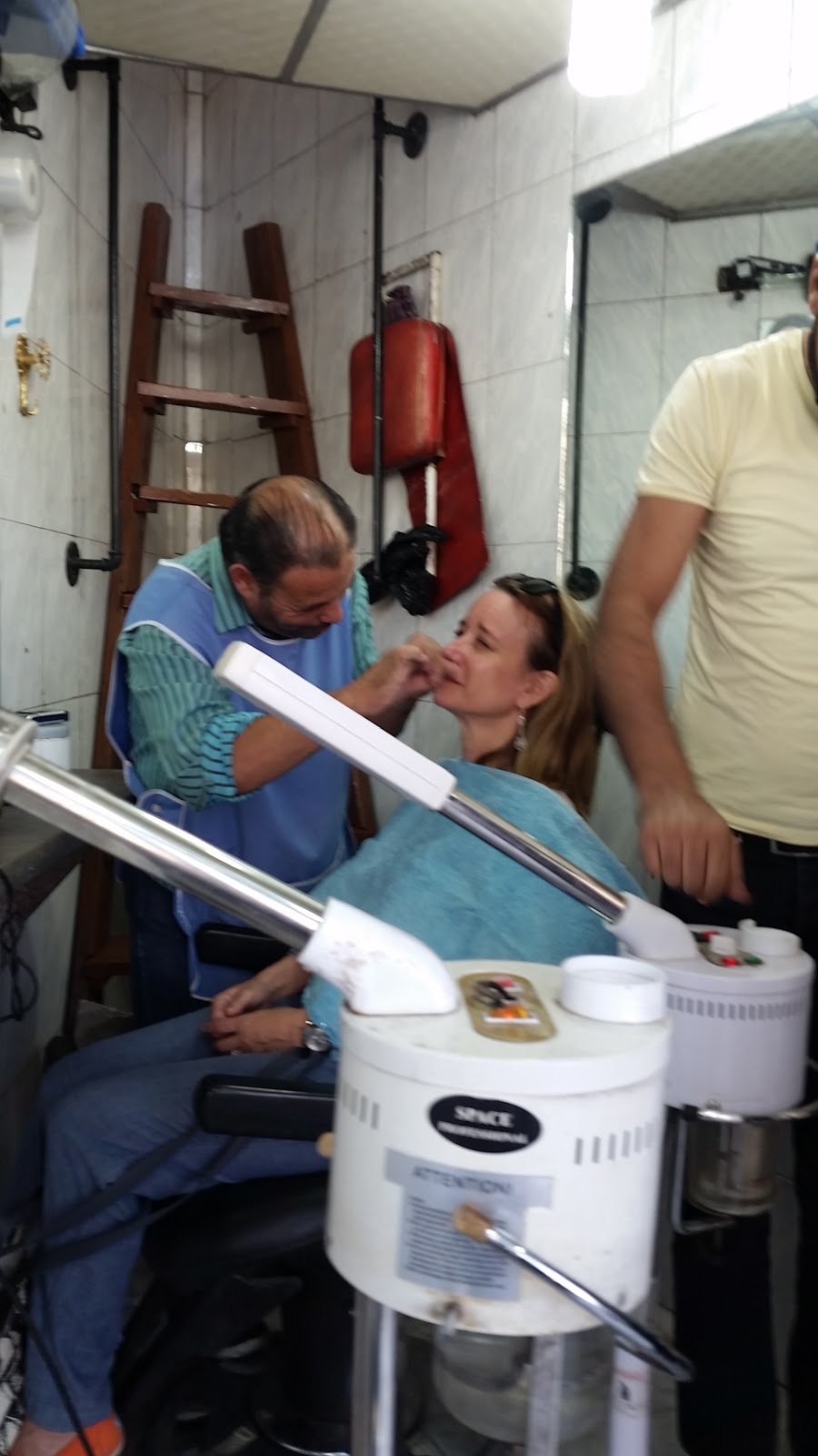 Next chair over, Mrs. S.A.M. is having her face threaded. Methodically ripping out any follicle, visible or not. This finished and she had mentholated ointment smeared on.