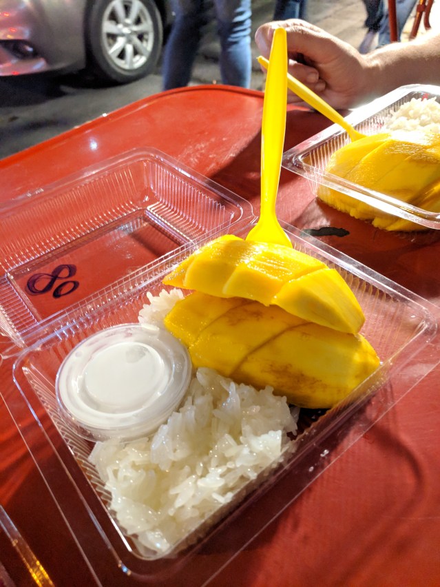 I loved it so, that I went back again the following night, and again tonight to make sure that it wasn’t a fluke. Tonight, we were recognized as regulars. The vendor, Khun One, picked out the boxes with the two best mangos. She threw in a free tea drink