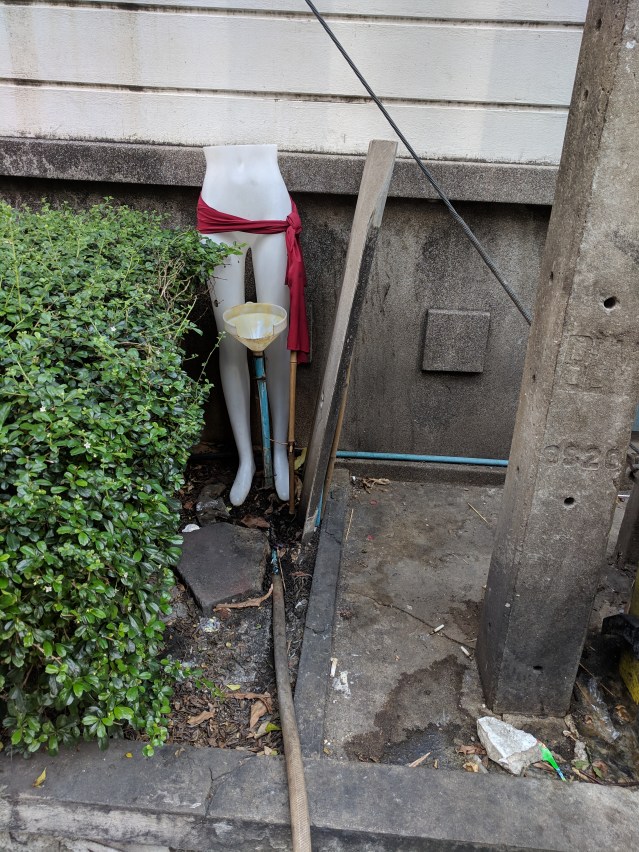 This is Thailand’s solution. Or at least a solution near my house. Nearby is a motorcycle taxi station. Another story for another time. But the drivers needed somewhere to relieve themselves so they rigged up this little contraption. The tube drains into a nearby storm drain. There’s a small sheet metal screen for privacy.