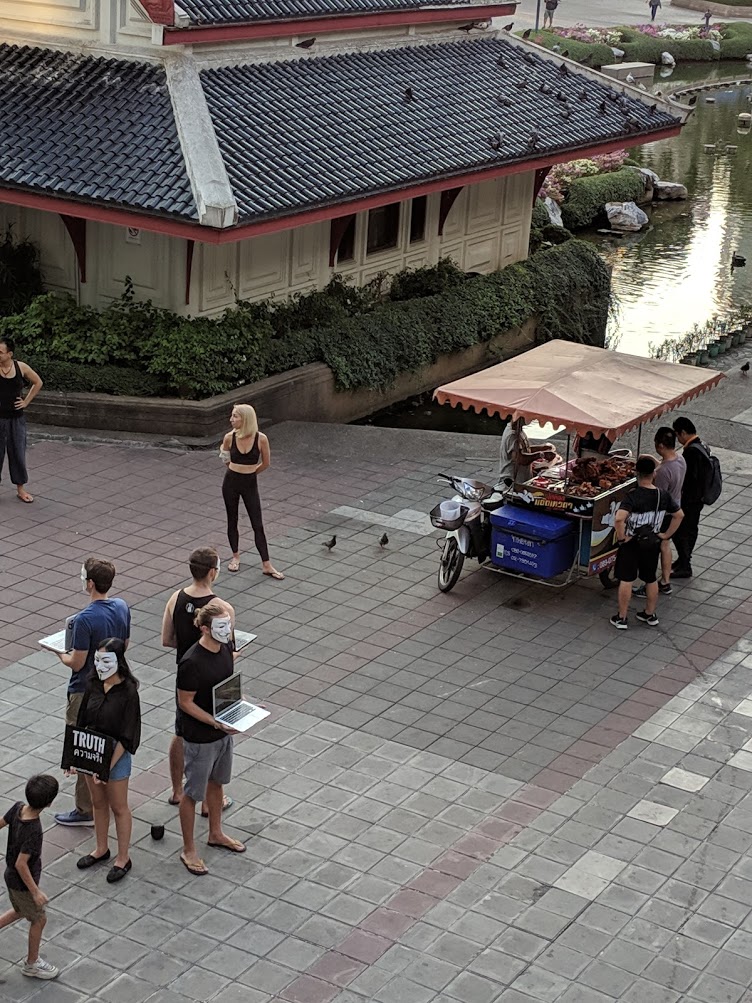 I imagine that they pre-game on steamed quinoa and berries. Their schtick, as you can see, is that don all black and wear Anon masks and they stand in a square formation. Each holding a laptop running a video about the downsides to eating meat.