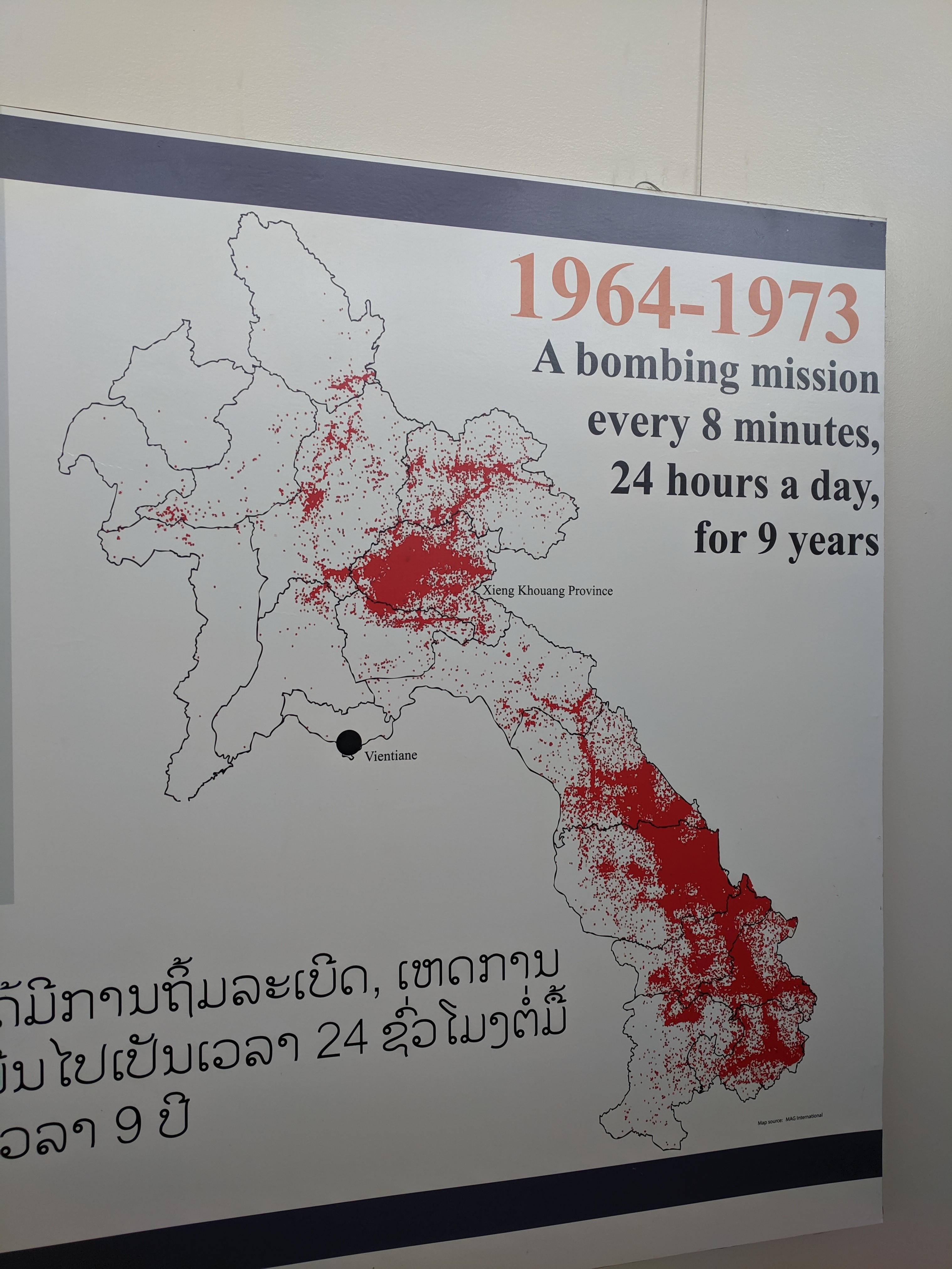 For a solid 9 years, from 1964-1973, bombers would take off from northern Thailand and loop up and over Laos and Cambodia and Vietnam and try and take out the trail and other sites. The rate of bombing missions averaged every 8 minutes, 24 hours a day for 9 years.