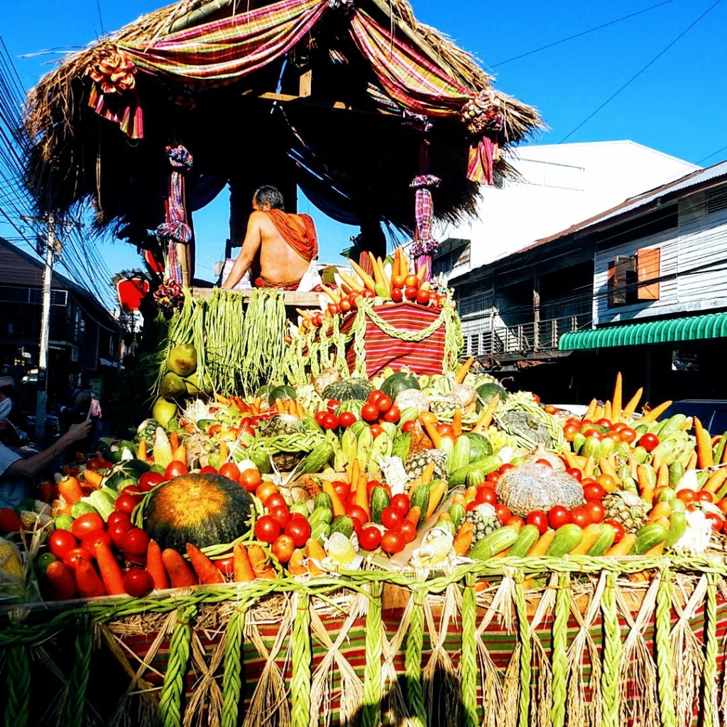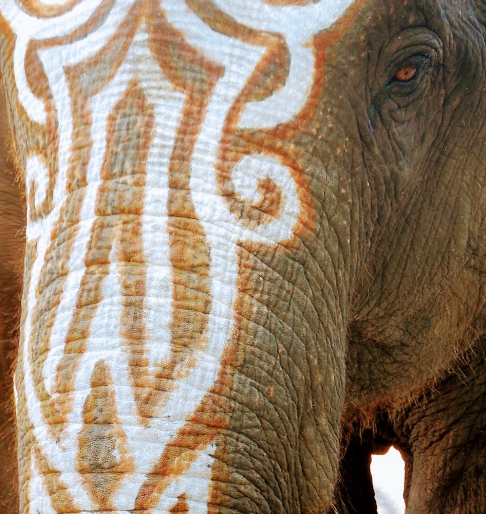 Bright and early on Friday, the town and the area elephants gather near the train station. Floats fashioned out of all the things elephants like to eat are interspersed. There are a couple of marching bands. And of course 200 elephants festooned with paint and crowns and moomoos. The area dignitaries ride on some. This, to me, would be a horrible honor, if anything for the heat. It’s become quite out of fashion to ride an elephant on a chair, but these folks still do it.