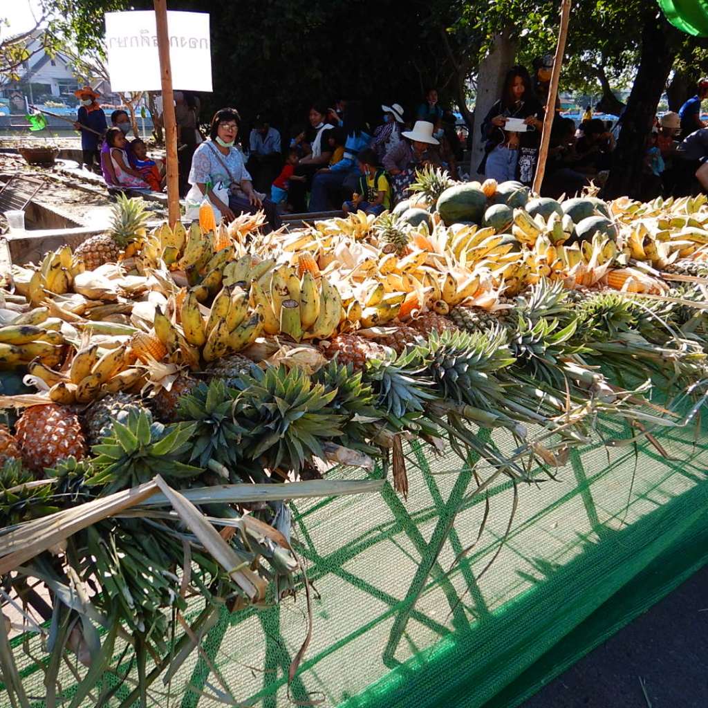 At the other end of town, the dignitaries are let off and then the elephants are let loose on a 500+meter long buffet table of elephant food. Spectators gather on one side and hand the elephants food. But the elephants can help themselves to whatever they want. It is a food orgy of gigantic proportions.